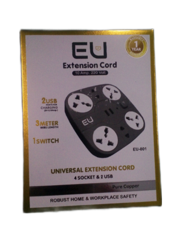 4 socket and 2 USB Port charging. 3 Metre wire length